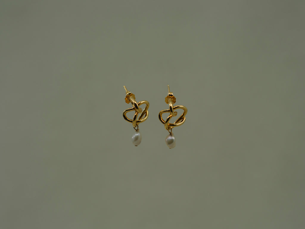 Dainty beauties interwoven to form a delicate form. Accentuated with fresh water pearls dangling from them, wear these by themselves or pair them with the Entwined Gold and Pearl Pendant to enhance your look.
