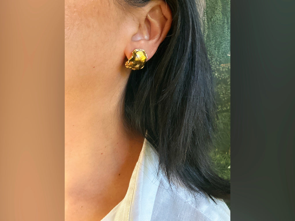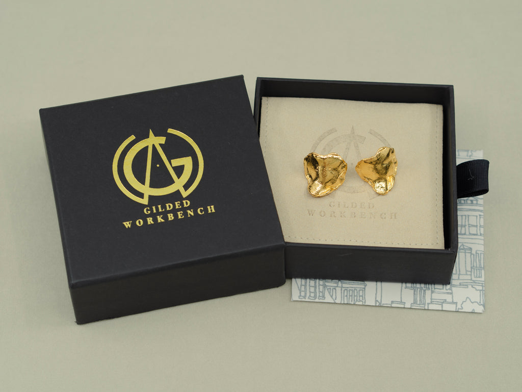 The simplicity of the gentle folds in these organic shaped earrings are a delight to see and wear. A true workhorse for your everyday style. They pair very well with our Foil Gold Pendant.Dimensions: Each earring top measures 0.75” in diameter.